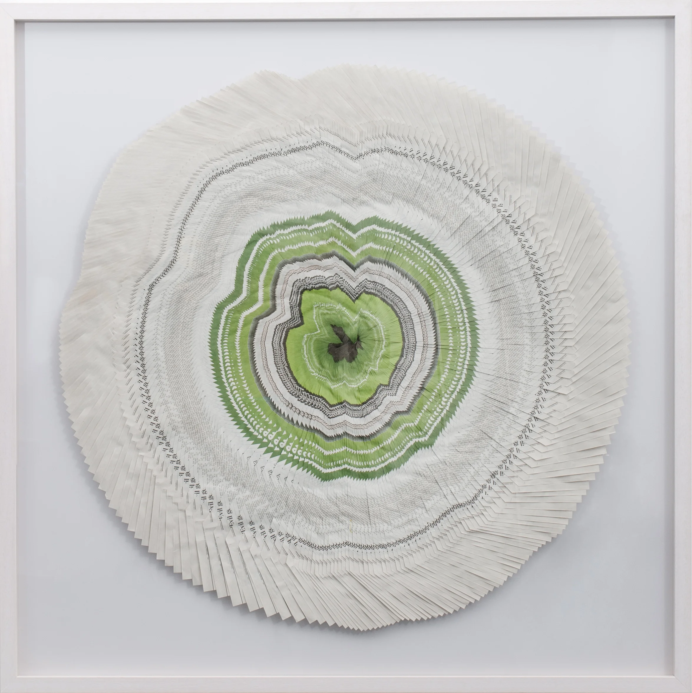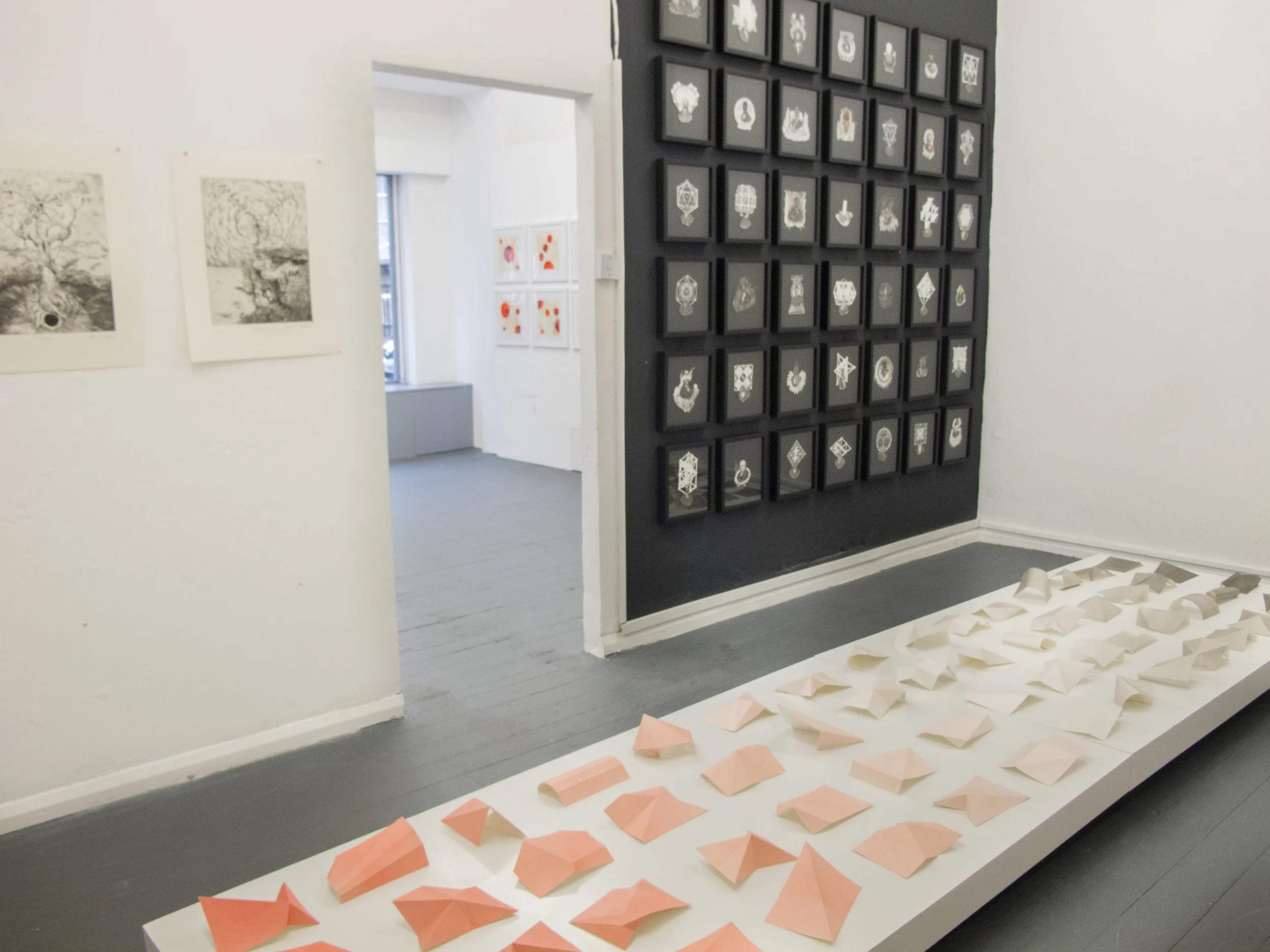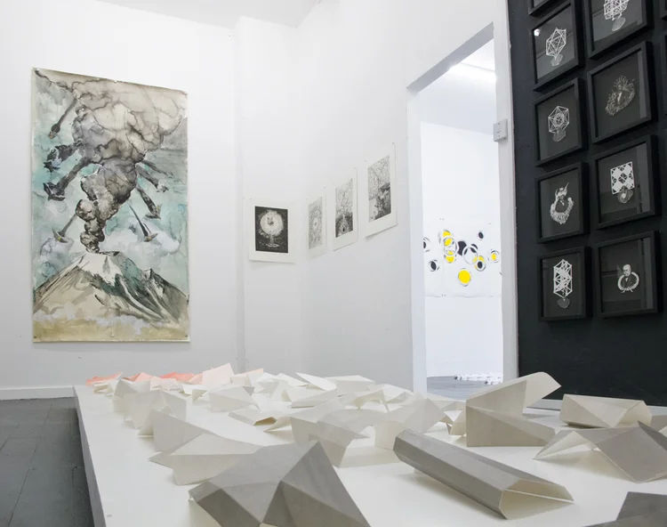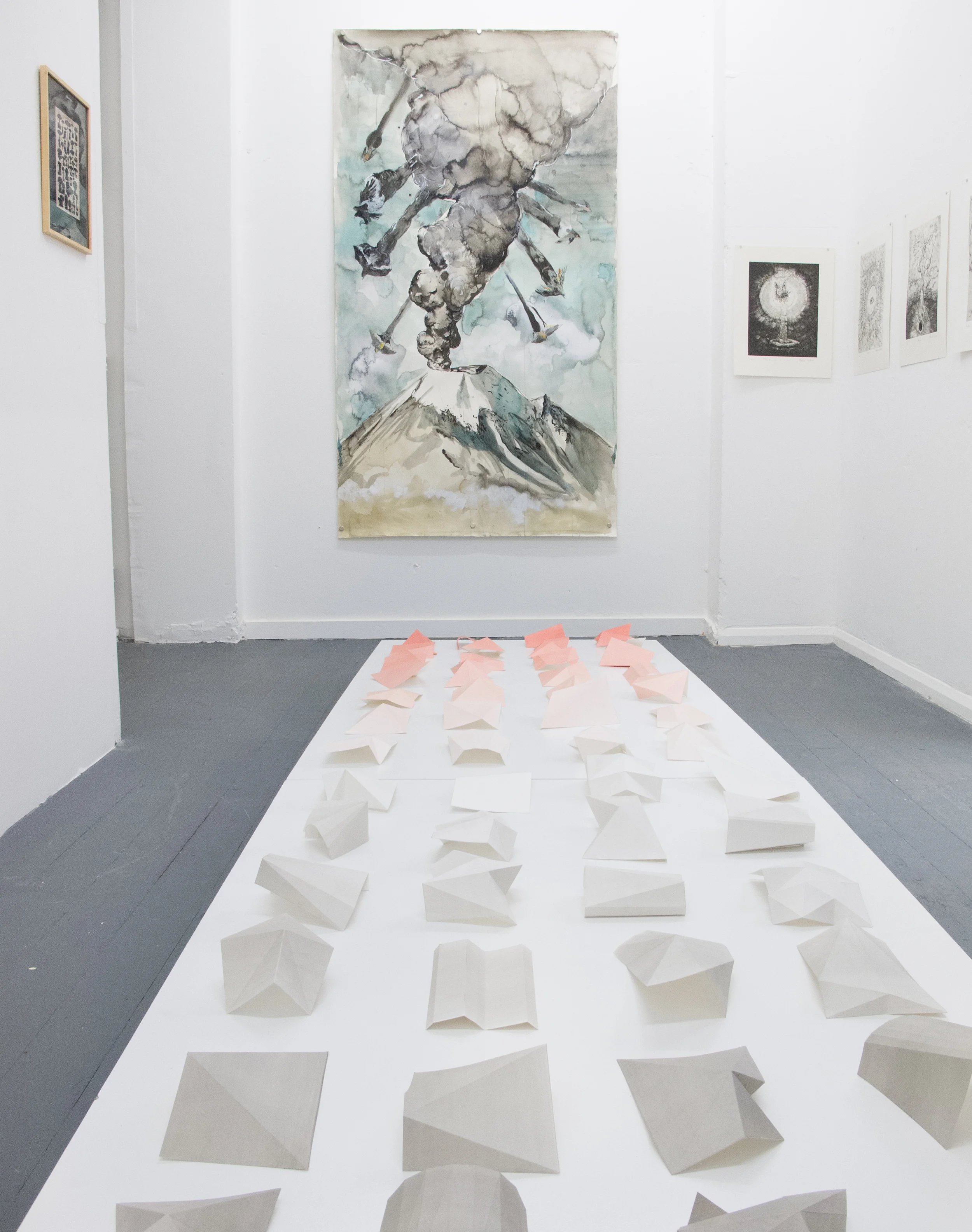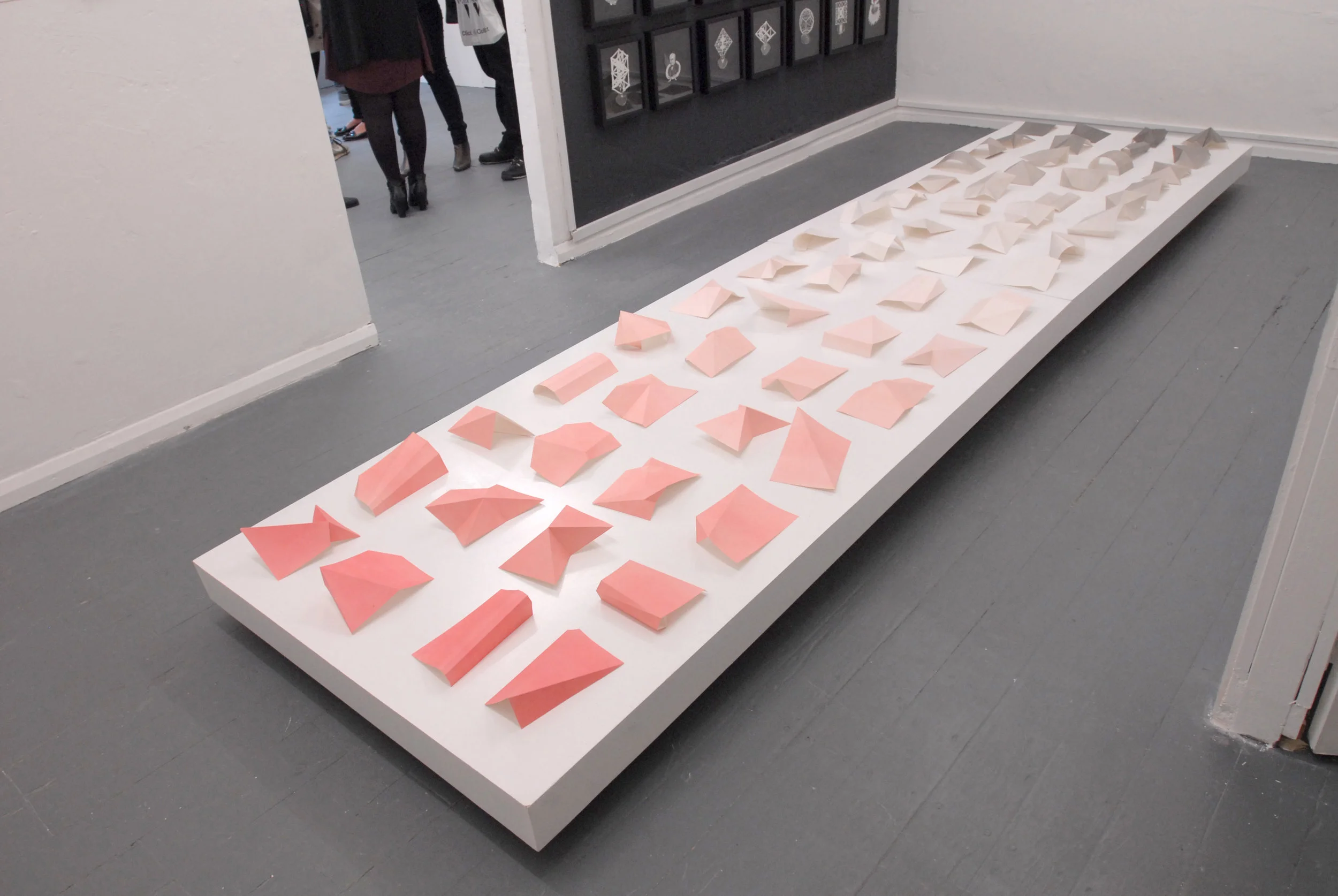 Installation of: Amadeo Azar, Pieza #1, 2015. watercolours and bee wax on folded paper (60). 100 x 400 cm.