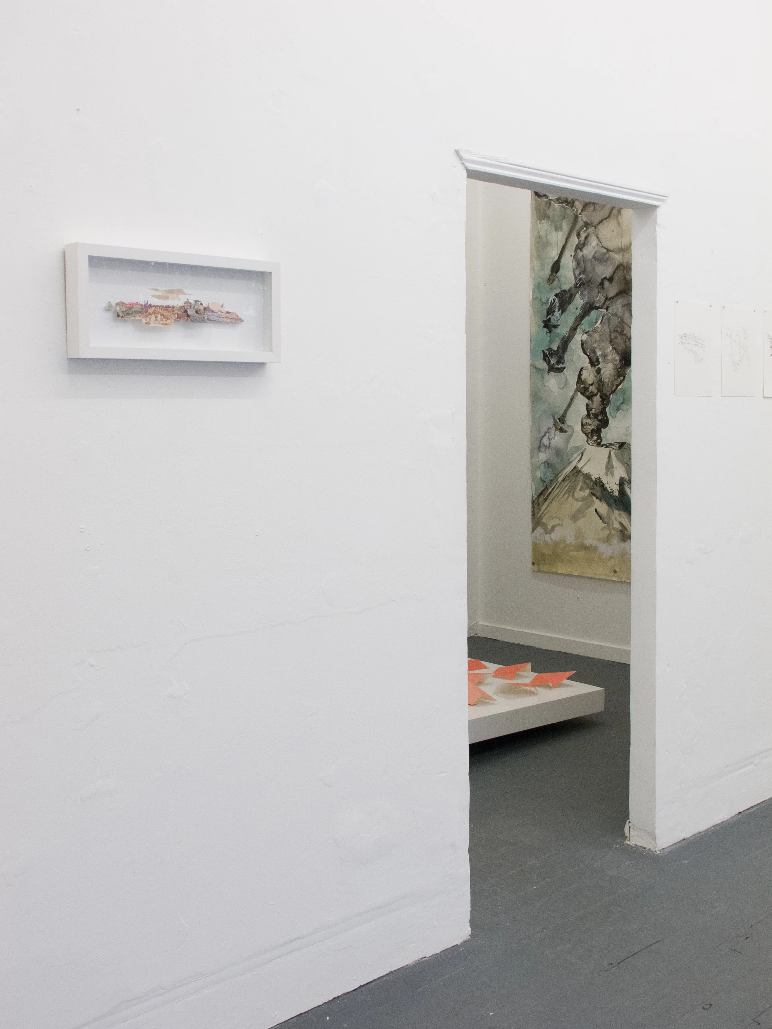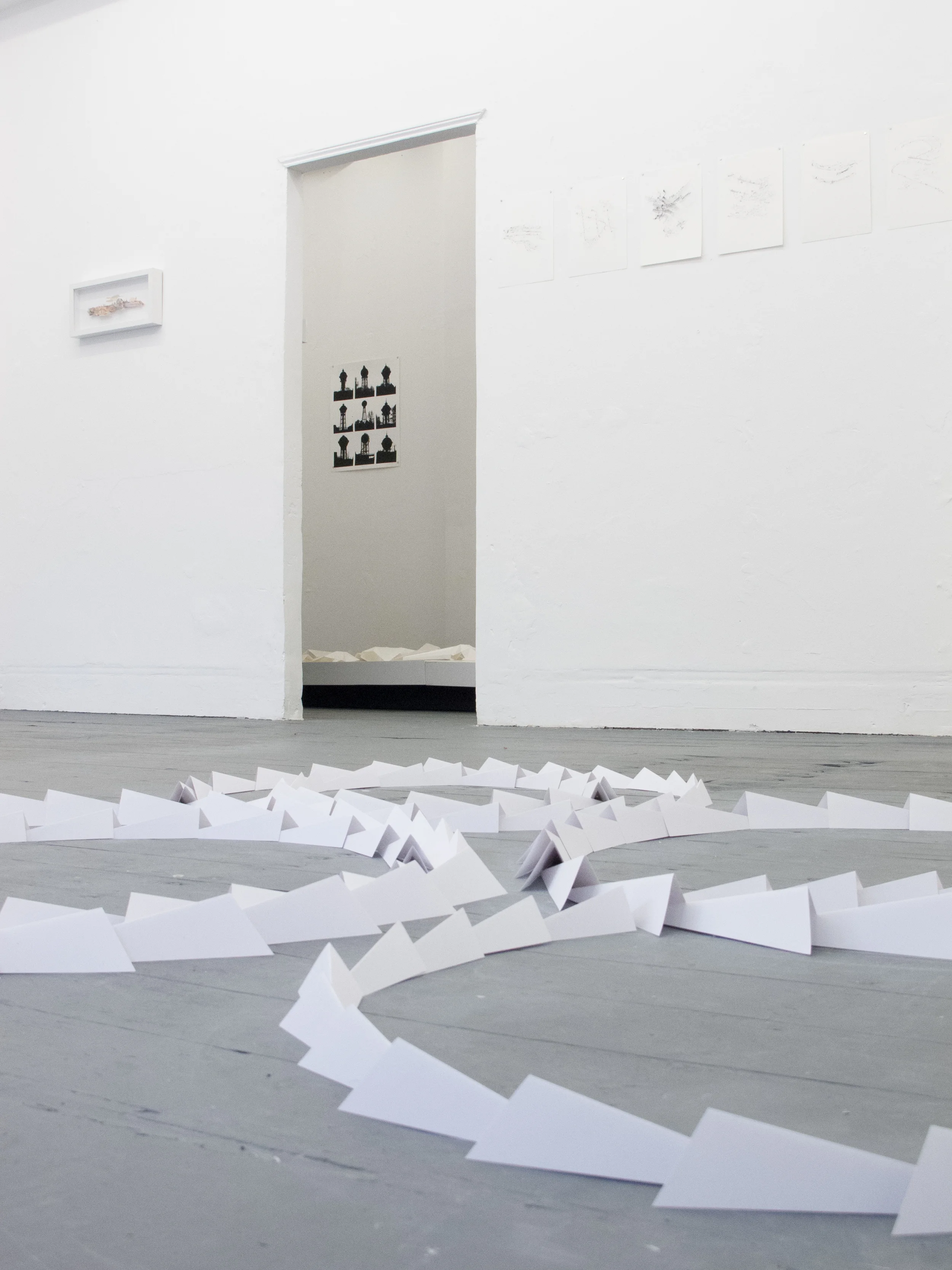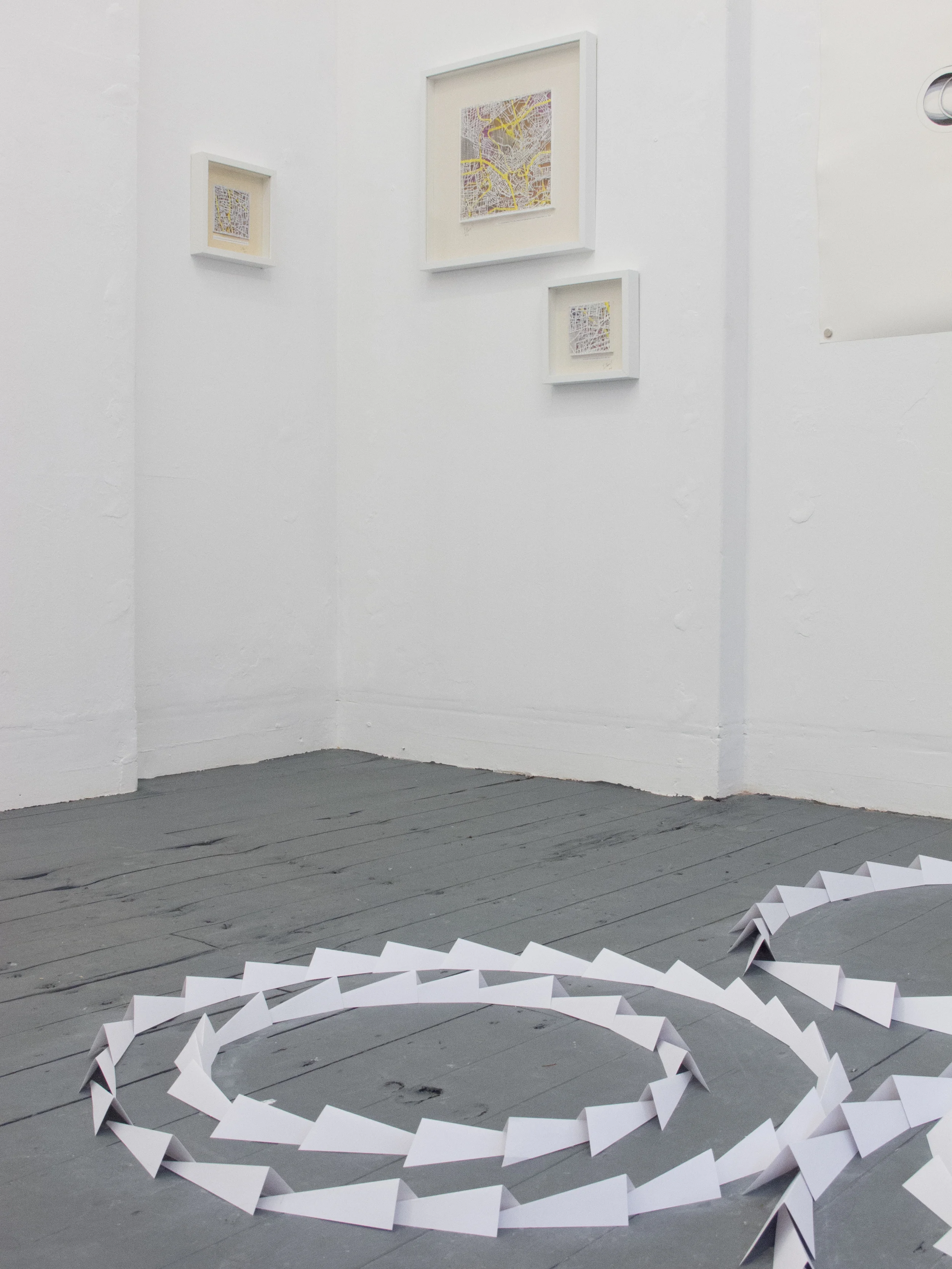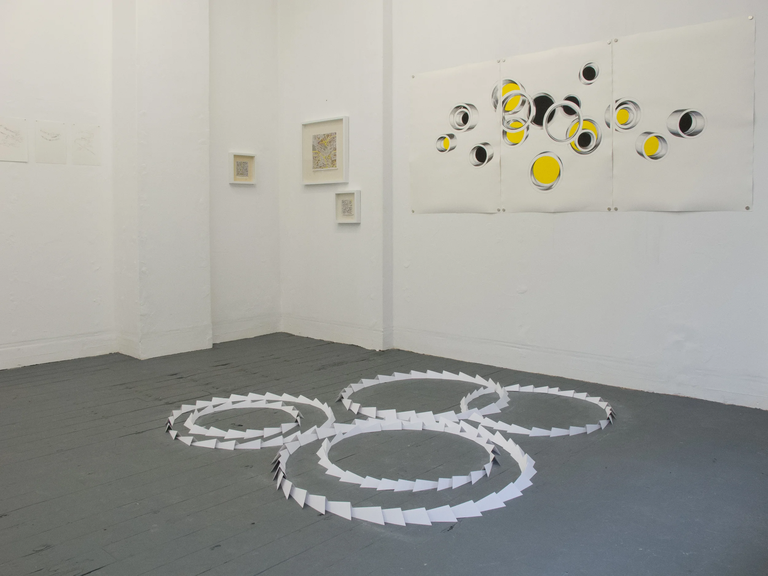 Installation of: Amadeo Azar, Pieza #1, 2015. watercolours and bee wax on folded paper (60). 100 x 400 cm.