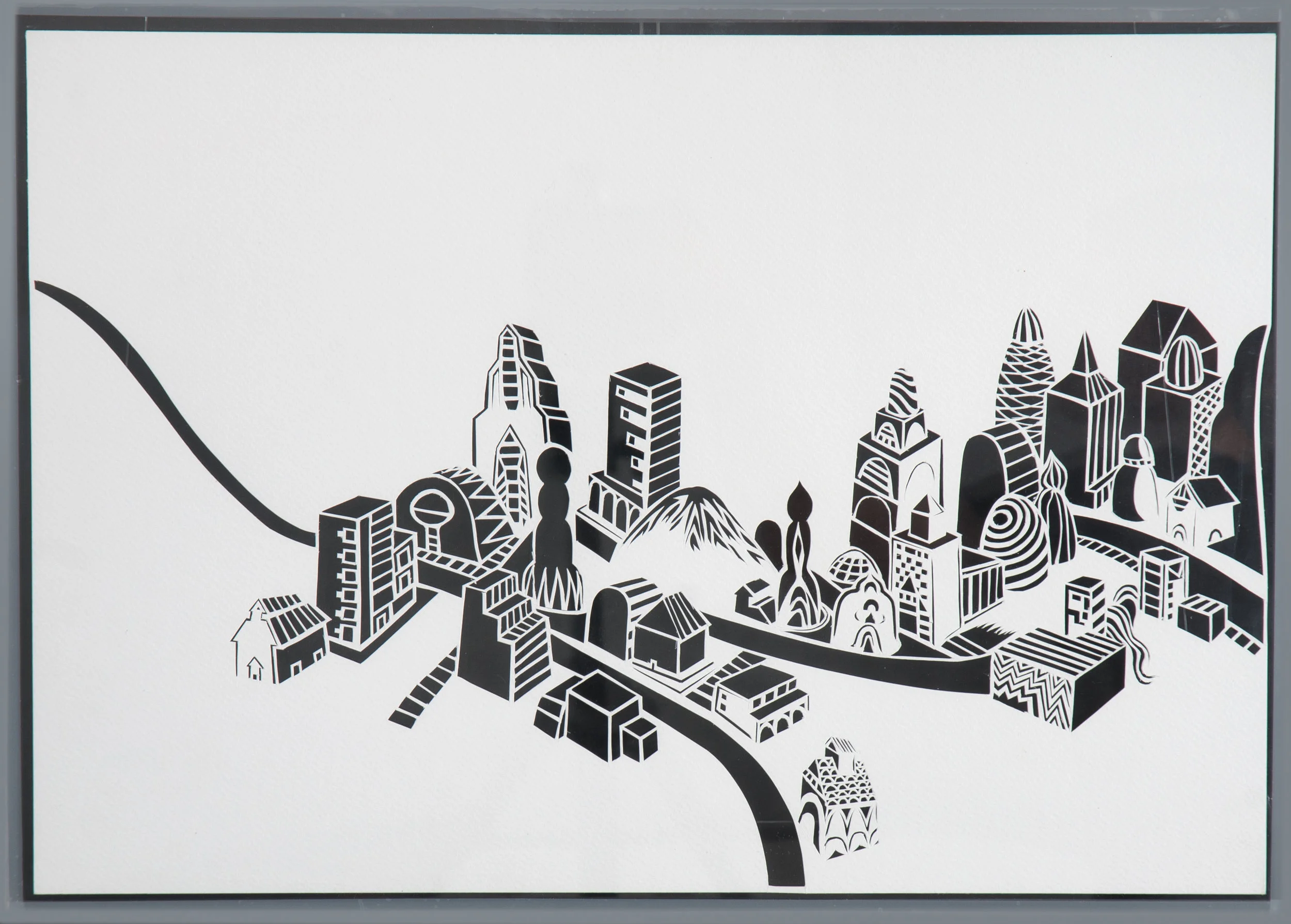Pedro Varela’s paintings and installations depict dense, graphic urban landscapes in a range of media, including acrylic, ballpoint and felt tip pens, and multicoloured vinyl stickers applied to the walls, floors, and stairs of gallery spaces. Featuring architecture, minarets, small islands, and shrubs, Varela’s urban environments consist of the outlines of historical buildings as well as imaginary ones, and sometimes include monochromatic planes and colourful roads that run along gallery floors, connecting different spaces. He also produces three-dimensional models of fictional cities composed of paper, wood, and acrylic, and blue paintings of imaginary groupings of plants and flowers.
