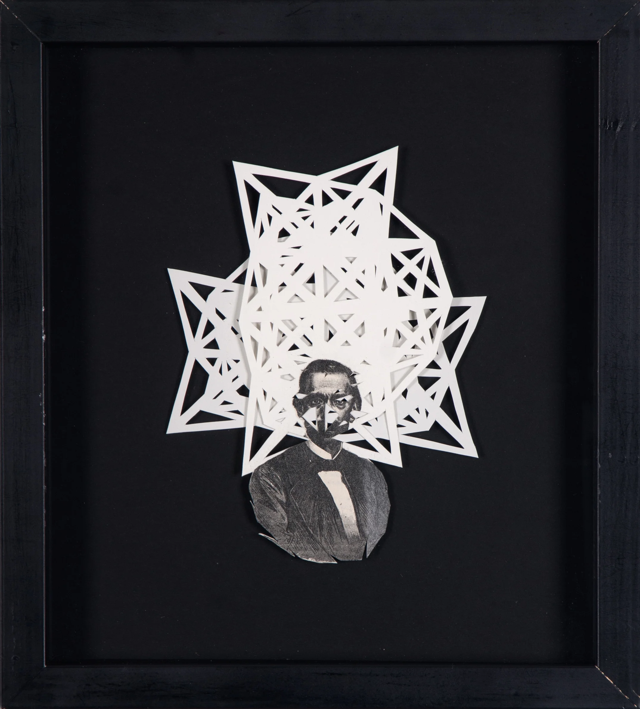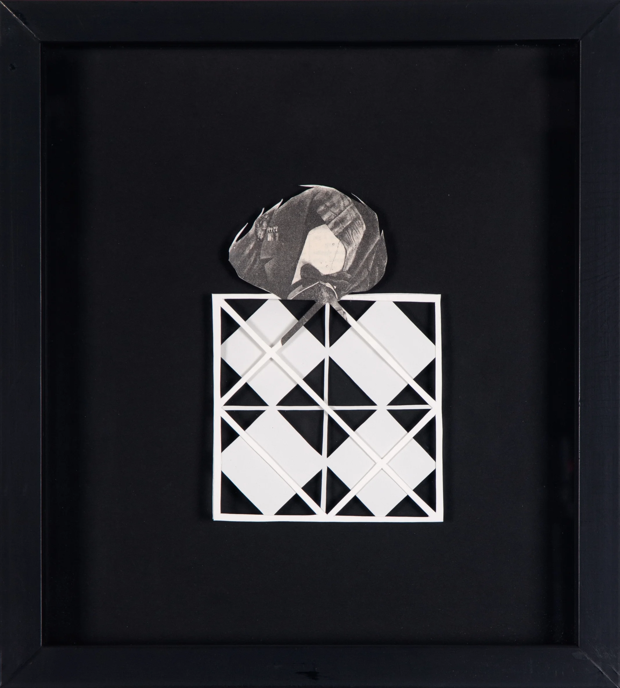 Omar Árcega. Sin Título (Untitled), 2016. Collage technique with pins, mixed media on paper. 29.5 x 23.5 x 5 cm (Framed).